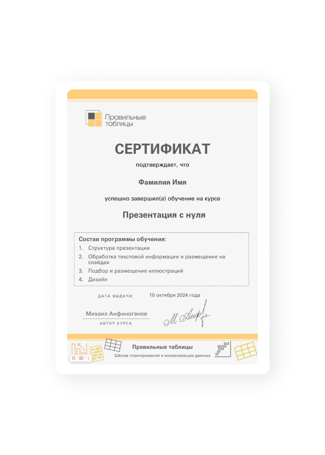 Если вводные данные для наполнения презентации уже готовы, то курс можно пройти за 1 день. Можно создавать презентацию, попутно формируя вводные данные, в таком случае прохождение курса займет 3-4 дня.